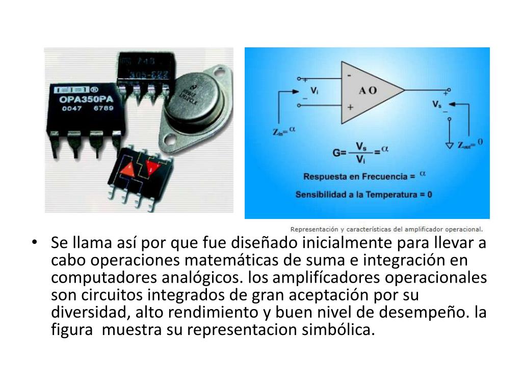Se llama así por que fue diseñado inicialmente para llevar a cabo operaciones matemáticas de suma e integración en computadores analógicos. los amplifícadores operacionales son circuitos integrados de gran aceptación por su diversidad, alto rendimiento y buen nivel de desempeño. la figura muestra su representacion simbólica.