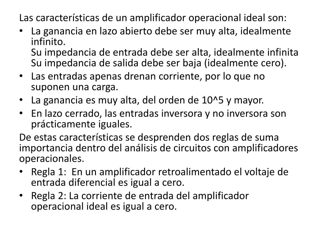 Las características de un amplificador operacional ideal son: • La ganancia en lazo abierto debe ser muy alta, idealmente infinito.Su impedancia de entrada debe ser alta, idealmente infinitaSu impedancia de salida debe ser baja (idealmente cero). • Las entradas apenas drenan corriente, por lo que no suponen una carga. • La ganancia es muy alta, del orden de 10^5 y mayor. • En lazo cerrado, las entradas inversora y no inversora son prácticamente iguales. De estas características se desprenden dos reglas de suma importancia dentro del análisis de circuitos con amplificadores operacionales. • Regla 1: En un amplificador retroalimentado el voltaje de entrada diferencial es igual a cero. • Regla 2: La corriente de entrada del amplificador operacional ideal es igual a cero.