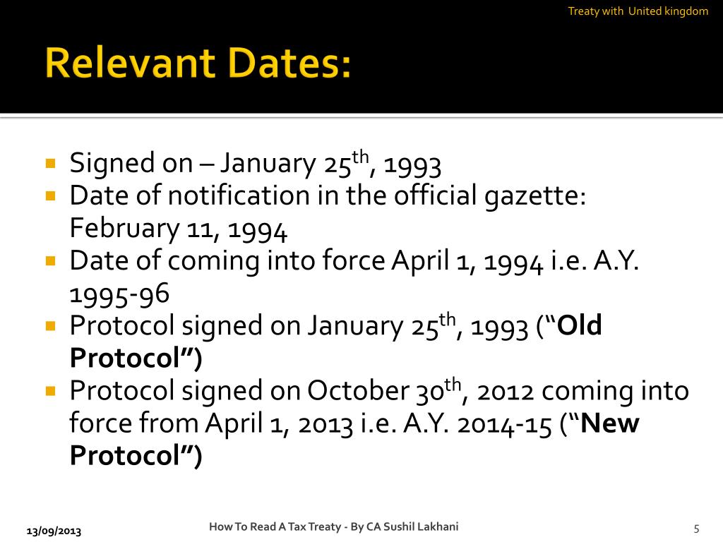 Relevant Dates: • Signed on – January 25th, 1993 • Date of notification in the official gazette: February 11, 1994 • Date of coming into force April 1, 1994 i.e. A.Y. 1995-96 • Protocol signed on January 25th, 1993 (“Old Protocol”) • Protocol signed on October 30th, 2012 coming into force from April 1, 2013 i.e. A.Y. 2014-15 (“New Protocol”) Treaty with United kingdom How To Read A Tax Treaty - By CA SushilLakhani 13/09/2013
