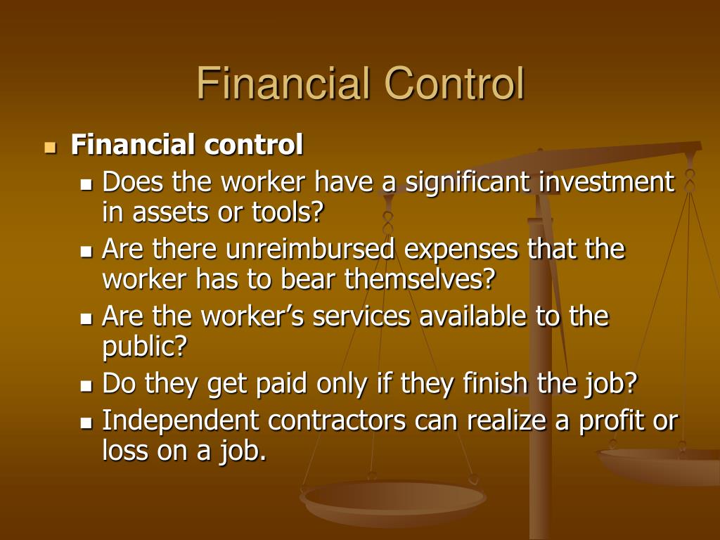 Financial Control Financial control Does the worker have a significant investment in assets or tools? Are there unreimbursed expenses that the worker has to bear themselves? Are the worker’s services available to the public? Do they get paid only if they finish the job? Independent contractors can realize a profit or loss on a job.
