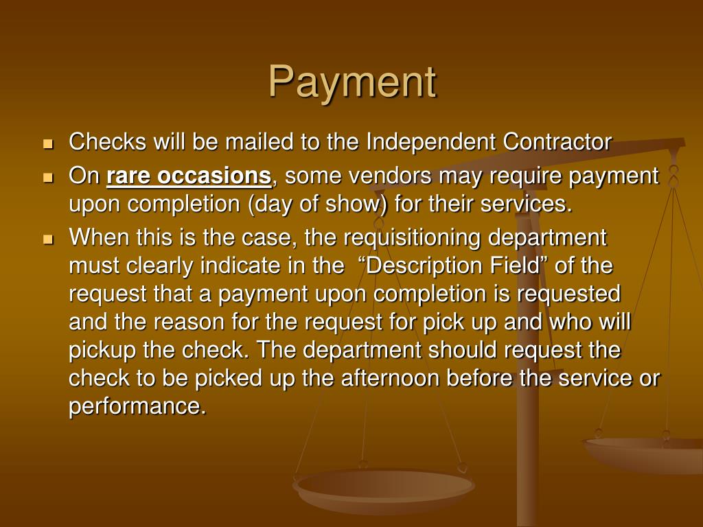 Payment Checks will be mailed to the Independent Contractor On rare occasions, some vendors may require payment upon completion (day of show) for their services. When this is the case, the requisitioning department must clearly indicate in the “Description Field” of the request that a payment upon completion is requested and the reason for the request for pick up and who will pickup the check. The department should request the check to be picked up the afternoon before the service or performance.