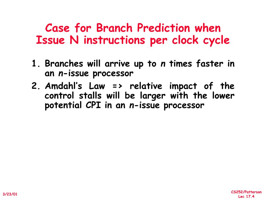 Case for Branch Prediction when Issue N instructions per clock cycle • Branches will arrive up to n times faster in an n-issue processor • Amdahl’s Law => relative impact of the control stalls will be larger with the lower potential CPI in an n-issue processor