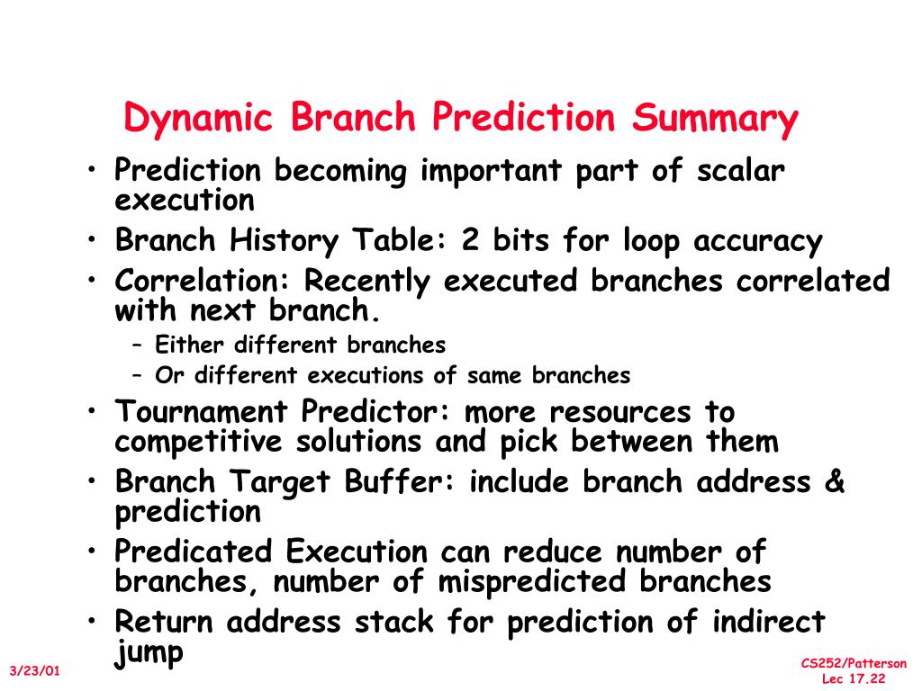 CS252Graduate Computer ArchitectureLecture 17: ILP and Dynamic Execution #2: Branch Prediction, Multiple Issue March 23, 2001 Prof. David A. Patterson Computer Science 252 Spring 2001