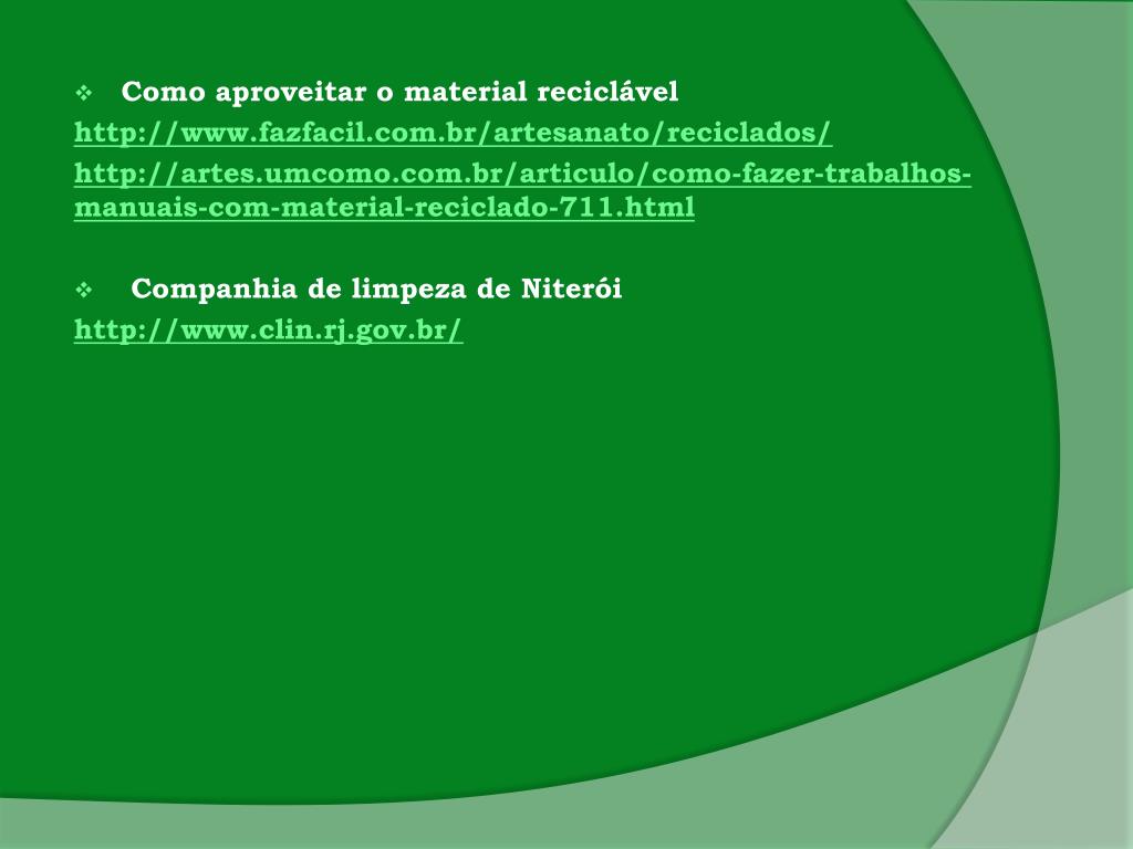 Como aproveitar o material reciclável http://www.fazfacil.com.br/artesanato/reciclados/ http://artes.umcomo.com.br/articulo/como-fazer-trabalhos-manuais-com-material-reciclado-711.html • Companhia de limpeza de Niterói http://www.clin.rj.gov.br/