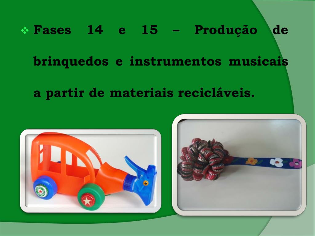 Fases 14 e 15 – Produção de brinquedos e instrumentosmusicais a partir de materiaisrecicláveis.
