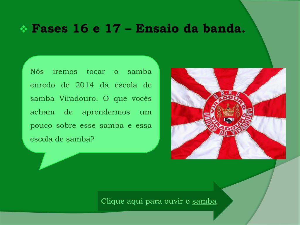 Fases 16 e 17 – Ensaio da banda. Nósiremostocar o samba enredo de 2014 da escola de samba Viradouro. O quevocêsacham de aprendermos um poucosobreesse samba e essaescola de samba? Clique aquiparaouvir o samba