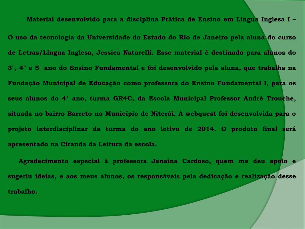 Material desenvolvidopara a disciplinaPrática de EnsinoemLínguaInglesa I – O uso da tecnologia da Universidade do Estado do Rio de Janeiro pelaaluna do curso de Letras/LínguaInglesa, Jessica Natarelli. Esse material é destinadoparaalunos do 3°, 4° e 5° ano do Ensino Fundamental e foidesenvolvidopelaaluna, quetrabalhanaFundação Municipal de Educaçãocomoprofessora do Ensino Fundamental I, paraosseusalunos do 4° ano, turma GR4C, da Escola Municipal Professor André Trouche, situada no bairroBarreto no Município de Niterói. A webquestfoidesenvolvidapara o projetointerdisciplinar da turma do anoletivo de 2014. O produto final seráapresentadonaCiranda da Leitura da escola. Agradecimento especial à professoraJanaína Cardoso, quem me deuapoio e sugeriuideias, e aosmeusalunos, osresponsáveispeladedicação e realizaçãodessetrabalho.