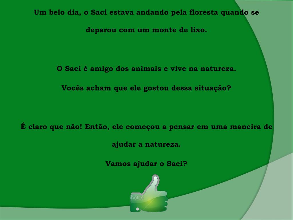 Um belodia, o Saciestavaandandopelaflorestaquando se deparou com um monte de lixo. O Saci é amigo dos animais e vive nanatureza. Vocêsachamqueelegostoudessasituação? É claroquenão! Então, elecomeçou a pensaremumamaneira de ajudar a natureza. Vamosajudar o Saci?