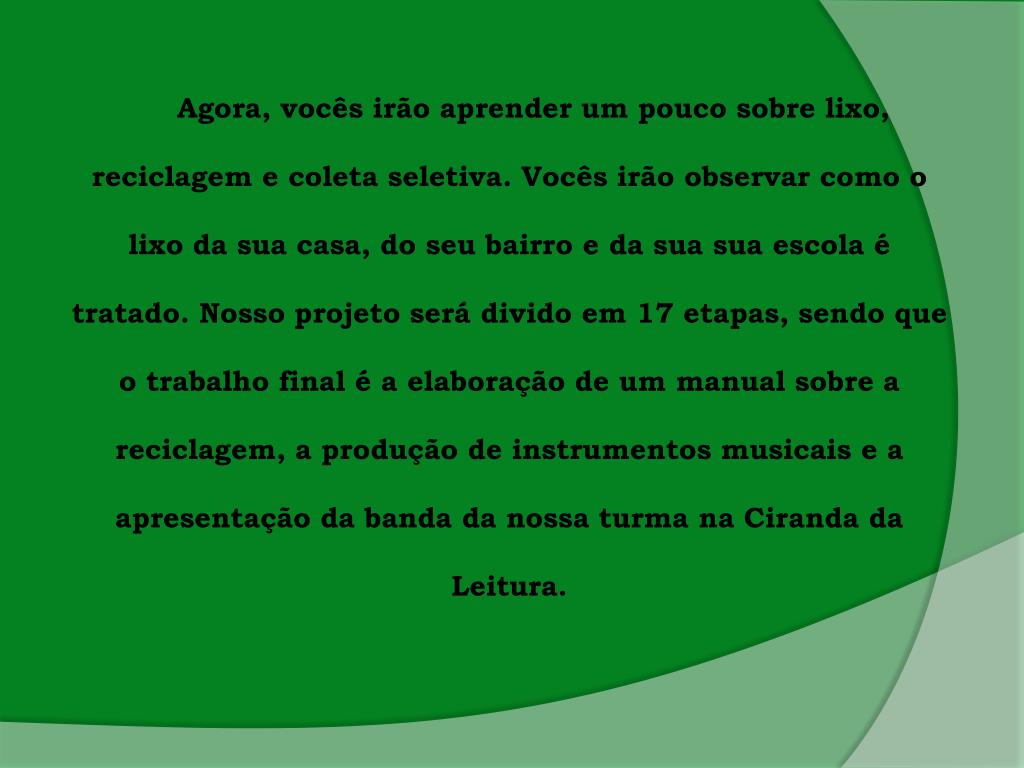 Agora, vocêsirãoaprender um poucosobrelixo, reciclagem e coletaseletiva. Vocêsirãoobservarcomo o lixo da sua casa, do seubairro e da suasuaescola é tratado. Nossoprojetoserádividoem 17 etapas, sendoque o trabalho final é a elaboração de um manual sobre a reciclagem, a produção de instrumentosmusicais e a apresentação da banda da nossaturmanaCiranda da Leitura.
