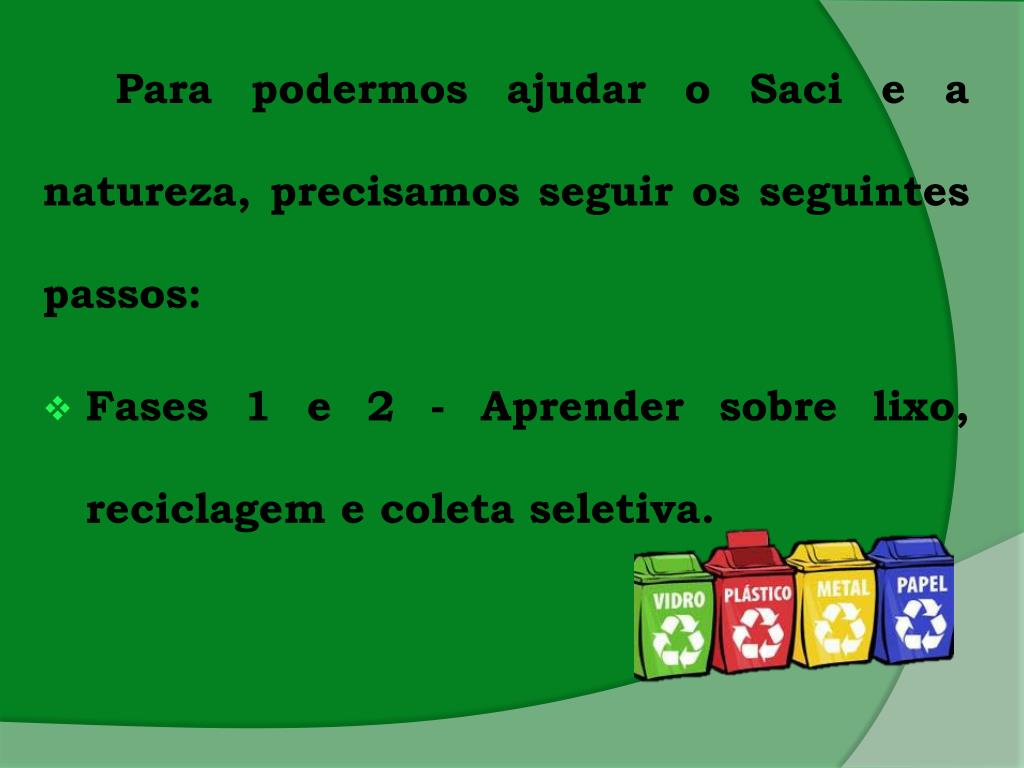 Para podermosajudar o Saci e a natureza, precisamosseguirosseguintespassos: • Fases 1 e 2 - Aprendersobrelixo, reciclagem e coletaseletiva.