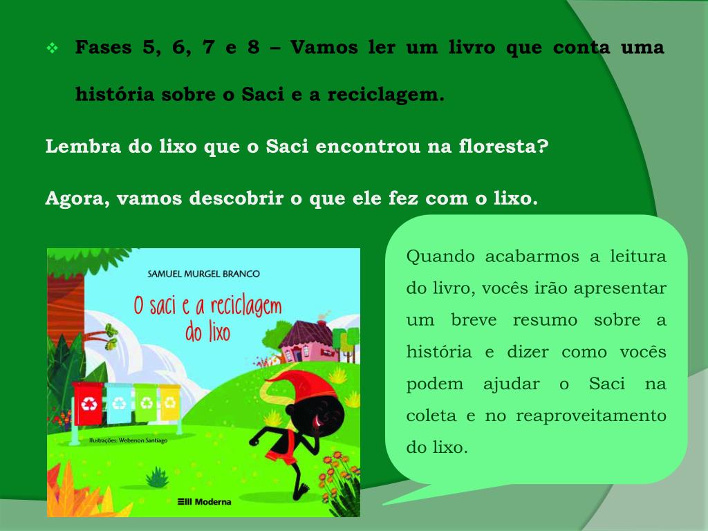 Fases 5, 6, 7 e 8 – Vamosler um livroquecontaumahistóriasobre o Saci e a reciclagem. Lembra do lixoque o Saciencontrounafloresta? Agora, vamosdescobrir o queele fez com o lixo. Quandoacabarmos a leitura do livro, vocêsirãoapresentar um breveresumosobre a história e dizercomovocêspodemajudar o Sacinacoleta e no reaproveitamento do lixo.