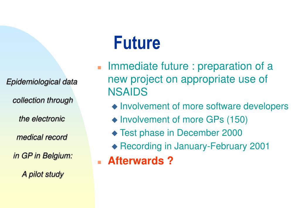 Future • Immediate future : preparation of a new project on appropriate use of NSAIDS • Involvement of more software developers • Involvement of more GPs (150) • Test phase in December 2000 • Recording in January-February 2001 • Afterwards ?