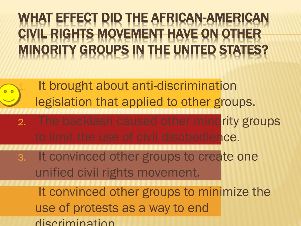 It brought about anti-discrimination legislation that applied to other groups. The backlash caused other minority groups to limit the use of civil disobedience. It convinced other groups to create one unified civil rights movement. It convinced other groups to minimize the use of protests as a way to end discrimination. What effect did the African-American civilrights movement have on other minority groups in the United States?