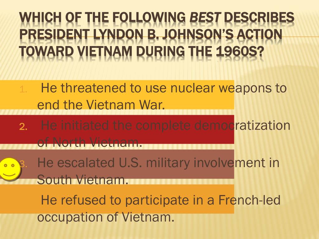 He threatened to use nuclear weapons to end the Vietnam War. • He initiated the complete democratization of North Vietnam. • He escalated U.S. military involvement in South Vietnam. • He refused to participate in a French-led occupation of Vietnam. Which of the followingbestdescribes PresidentLyndon B. Johnson’s action toward Vietnam during the 1960s?