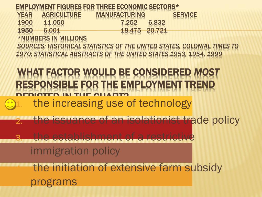 the increasing use of technology the issuance of an isolationist trade policy the establishment of a restrictive immigration policy the initiation of extensive farm subsidy programs Employment Figures for Three Economic Sectors* Year Agriculture Manufacturing Service 1900 11,050 7,252 6,832 1950 6,001 18,475 20,721 *numbers in millionsSources: Historical Statistics of the United States, Colonial Times to 1970; Statistical Abstracts of the United States,1953, 1954, 1999What factor would be considered most responsible for the employment trend depicted in the chart?