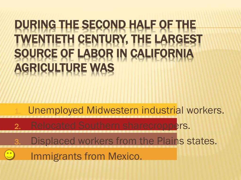 Unemployed Midwestern industrial workers. • Relocated Southern sharecroppers. • Displaced workers from the Plains states. • Immigrants from Mexico. During the second half of the twentieth century,the largest source of labor in California agriculture was