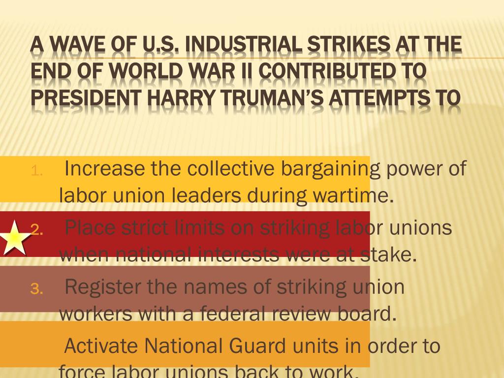 Increase the collective bargaining power of labor union leaders during wartime. Place strict limits on striking labor unions when national interests were at stake. Register the names of striking union workers with a federal review board. Activate National Guard units in order to force labor unions back to work. A wave of U.S. industrial strikes at the end ofWorld War II contributed to President Harry Truman’s attempts to