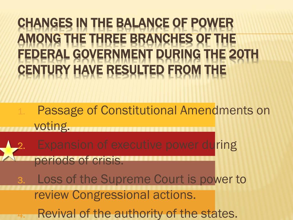 Passage of Constitutional Amendments on voting. Expansion of executive power during periods of crisis. Loss of the Supreme Court is power to review Congressional actions. Revival of the authority of the states. Changes in the balance of power among thethree branches of the Federal government during the 20th century have resulted from the