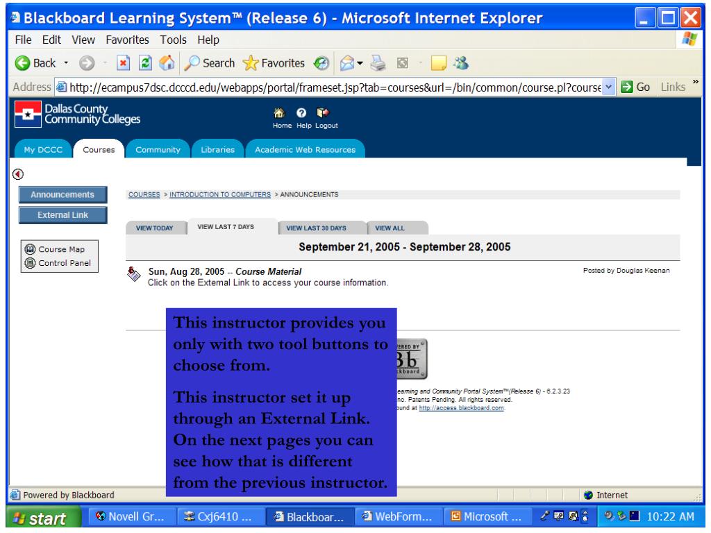 This instructor provides you only with two tool buttons to choose from. This instructor set it up through an External Link. On the next pages you can see how that is different from the previous instructor.