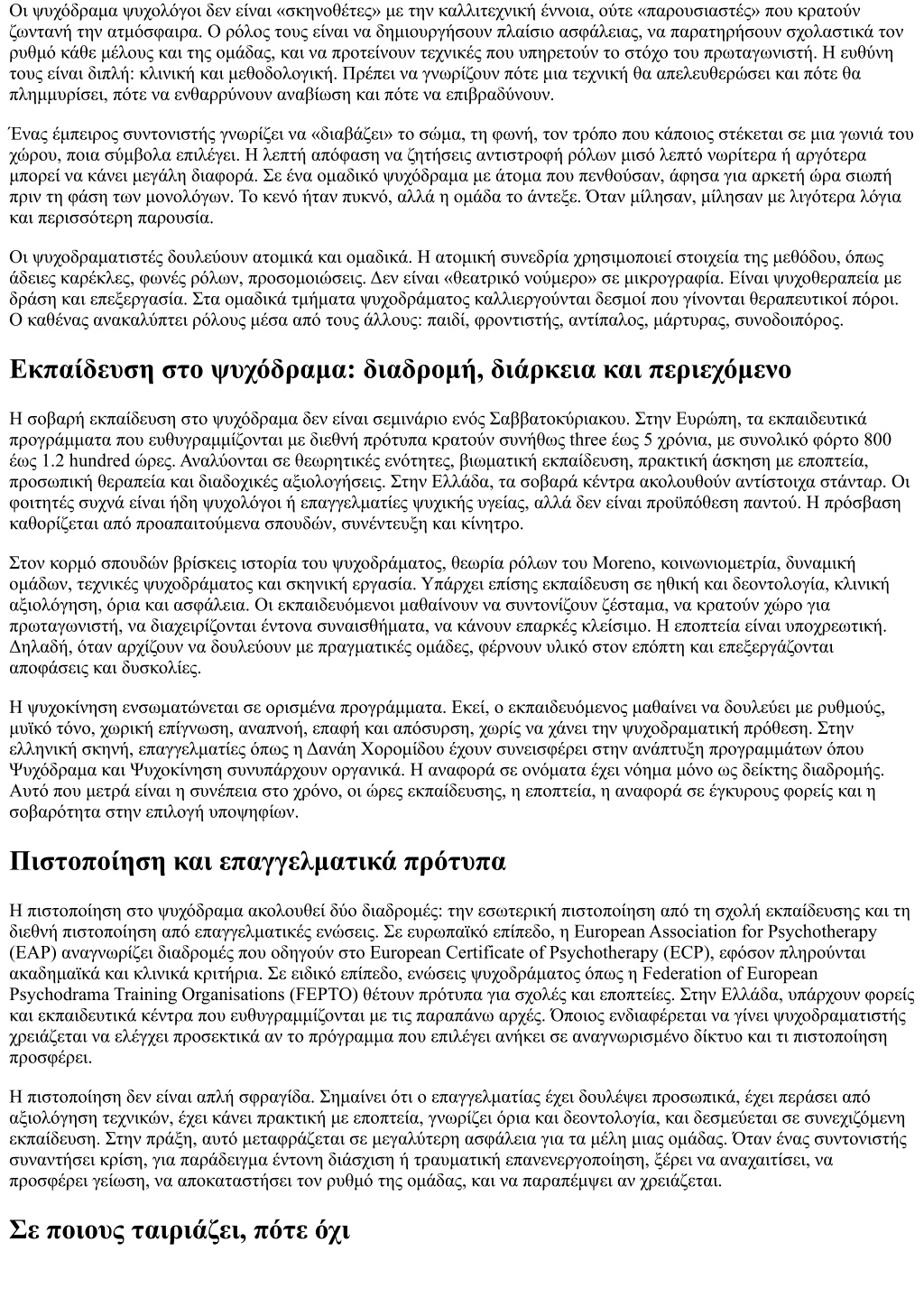 Οι ψυχόδραμα ψυχολόγοι δεν είναι «σκηνοθέτες» με την καλλιτεχνική έννοια, ούτε «παρουσιαστές» που κρατούν ζωντανή την ατμόσφαιρα. Ο ρόλος τους είναι να δημιουργήσουν πλαίσιο ασφάλειας, να παρατηρήσουν σχολαστικά τον ρυθμό κάθε μέλους και της ομάδας, και να προτείνουν τεχνικές που υπηρετούν το στόχο του πρωταγωνιστή. Η ευθύνη τους είναι διπλή: κλινική και μεθοδολογική. Πρέπει να γνωρίζουν πότε μια τεχνική θα απελευθερώσει και πότε θα πλημμυρίσει, πότε να ενθαρρύνουν αναβίωση και πότε να επιβραδύνουν. Ένας έμπειρος συντονιστής γνωρίζει να «διαβάζει» το σώμα, τη φωνή, τον τρόπο που κάποιος στέκεται σε μια γωνιά του χώρου, ποια σύμβολα επιλέγει. Η λεπτή απόφαση να ζητήσεις αντιστροφή ρόλων μισό λεπτό νωρίτερα ή αργότερα μπορεί να κάνει μεγάλη διαφορά. Σε ένα ομαδικό ψυχόδραμα με άτομα που πενθούσαν, άφησα για αρκετή ώρα σιωπή πριν τη φάση των μονολόγων. Το κενό ήταν πυκνό, αλλά η ομάδα το άντεξε. Όταν μίλησαν, μίλησαν με λιγότερα λόγια και περισσότερη παρουσία. Οι ψυχοδραματιστές δουλεύουν ατομικά και ομαδικά. Η ατομική συνεδρία χρησιμοποιεί στοιχεία της μεθόδου, όπως άδειες καρέκλες, φωνές ρόλων, προσομοιώσεις. Δεν είναι «θεατρικό νούμερο» σε μικρογραφία. Είναι ψυχοθεραπεία με δράση και επεξεργασία. Στα ομαδικά τμήματα ψυχοδράματος καλλιεργούνται δεσμοί που γίνονται θεραπευτικοί πόροι. Ο καθένας ανακαλύπτει ρόλους μέσα από τους άλλους: παιδί, φροντιστής, αντίπαλος, μάρτυρας, συνοδοιπόρος. Εκπαίδευση στο ψυχόδραμα: διαδρομή, διάρκεια και περιεχόμενο Η σοβαρή εκπαίδευση στο ψυχόδραμα δεν είναι σεμινάριο ενός Σαββατοκύριακου. Στην Ευρώπη, τα εκπαιδευτικά προγράμματα που ευθυγραμμίζονται με διεθνή πρότυπα κρατούν συνήθως three έως 5 χρόνια, με συνολικό φόρτο 800 έως 1.2 hundred ώρες. Αναλύονται σε θεωρητικές ενότητες, βιωματική εκπαίδευση, πρακτική άσκηση με εποπτεία, προσωπική θεραπεία και διαδοχικές αξιολογήσεις. Στην Ελλάδα, τα σοβαρά κέντρα ακολουθούν αντίστοιχα στάνταρ. Οι φοιτητές συχνά είναι ήδη ψυχολόγοι ή επαγγελματίες ψυχικής υγείας, αλλά δεν είναι προϋπόθεση παντού. Η πρόσβαση καθορίζεται από προαπαιτούμενα σπουδών, συνέντευξη και κίνητρο. Στον κορμό σπουδών βρίσκεις ιστορία του ψυχοδράματος, θεωρία ρόλων του Moreno, κοινωνιομετρία, δυναμική ομάδων, τεχνικές ψυχοδράματος και σκηνική εργασία. Υπάρχει επίσης εκπαίδευση σε ηθική και δεοντολογία, κλινική αξιολόγηση, όρια και ασφάλεια. Οι εκπαιδευόμενοι μαθαίνουν να συντονίζουν ζέσταμα, να κρατούν χώρο για πρωταγωνιστή, να διαχειρίζονται έντονα συναισθήματα, να κάνουν επαρκές κλείσιμο. Η εποπτεία είναι υποχρεωτική. Δηλαδή, όταν αρχίζουν να δουλεύουν με πραγματικές ομάδες, φέρνουν υλικό στον επόπτη και επεξεργάζονται αποφάσεις και δυσκολίες. Η ψυχοκίνηση ενσωματώνεται σε ορισμένα προγράμματα. Εκεί, ο εκπαιδευόμενος μαθαίνει να δουλεύει με ρυθμούς, μυϊκό τόνο, χωρική επίγνωση, αναπνοή, επαφή και απόσυρση, χωρίς να χάνει την ψυχοδραματική πρόθεση. Στην ελληνική σκηνή, επαγγελματίες όπως η Δανάη Χορομίδου έχουν συνεισφέρει στην ανάπτυξη προγραμμάτων όπου Ψυχόδραμα και Ψυχοκίνηση συνυπάρχουν οργανικά. Η αναφορά σε ονόματα έχει νόημα μόνο ως δείκτης διαδρομής. Αυτό που μετρά είναι η συνέπεια στο χρόνο, οι ώρες εκπαίδευσης, η εποπτεία, η αναφορά σε έγκυρους φορείς και η σοβαρότητα στην επιλογή υποψηφίων. Πιστοποίηση και επαγγελματικά πρότυπα Η πιστοποίηση στο ψυχόδραμα ακολουθ