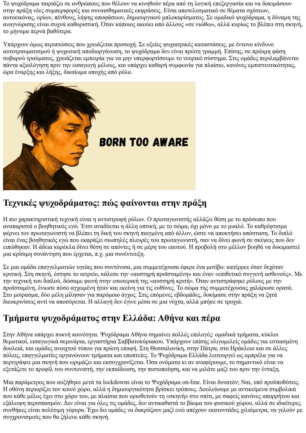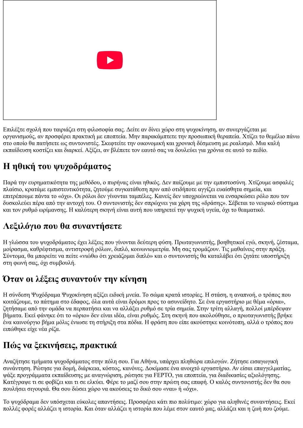Επιλέξτε σχολή που ταιριάζει στη φιλοσοφία σας. Δείτε αν δίνει χώρο στη ψυχοκίνηση, αν συνεργάζεται με οργανισμούς, αν προσφέρει πρακτική με εποπτεία. Μην παρακάμπτετε την προσωπική θεραπεία. Χτίζει το θεμέλιο πάνω στο οποίο θα πατήσετε ως συντονιστές. Σκεφτείτε την οικονομική και χρονική δέσμευση με ρεαλισμό. Μια καλή εκπαίδευση κοστίζει και διαρκεί. Αξίζει, αν βλέπετε τον εαυτό σας να δουλεύει για χρόνια σε αυτό το πεδίο. Η ηθική του ψυχοδράματος Παρά την ευρηματικότητα της μεθόδου, ο πυρήνας είναι ηθικός. Δεν παίζουμε με την εμπιστοσύνη. Χτίζουμε ασφαλές πλαίσιο, κρατάμε εμπιστευτικότητα, ζητούμε συγκατάθεση πριν από οτιδήποτε αγγίζει ευαίσθητα σημεία, και επιτρέπουμε πάντα το «όχι». Οι ρόλοι δεν γίνονται ταμπέλες. Κανείς δεν υποχρεώνεται να ενσαρκώσει ρόλο που τον δυσκολεύει πέρα από την αντοχή του. Ο συντονιστής δεν σπρώχνει για χάρη της «δράσης». Σέβεται το νευρικό σύστημα και τον ρυθμό ωρίμανσης. Η καλύτερη σκηνή είναι αυτή που υπηρετεί την ψυχική υγεία, όχι το θεαματικό. Λεξιλόγιο που θα συναντήσετε Η γλώσσα του ψυχοδράματος έχει λέξεις που γίνονται δεύτερη φύση. Πρωταγωνιστής, βοηθητικοί εγώ, σκηνή, ζέσταμα, μοίρασμα, καθρέφτισμα, αντιστροφή ρόλων, διπλό, κοινωνιομετρία. Μη σας τρομάζουν. Τις μαθαίνεις στην πράξη. Σύντομα, θα μπορείτε να πείτε «νιώθω ότι χρειάζομαι διπλό» και ο συντονιστής θα καταλάβει ότι ζητάτε υποστήριξη στη φωνή σας, όχι συμβουλή. Όταν οι λέξεις συναντούν την κίνηση Η σύνδεση Ψυχόδραμα Ψυχοκίνηση αξίζει ειδική μνεία. Το σώμα κρατά ιστορίες. Η στάση, η αναπνοή, ο τρόπος που κοιτάζουμε, το πάτημα στο έδαφος, όλα αυτά είναι δρόμοι προς το ασυνείδητο. Σε ένα εργαστήριο με θέμα «όρια», ζητήσαμε από την ομάδα να περπατήσει και να αλλάξει ρυθμό σε τρία σημεία. Στην τρίτη αλλαγή, πολλοί μπέρδεψαν βήματα. Εκεί φάνηκε ότι το «όριο» δεν είναι ιδέα, είναι ρυθμός. Στη σκηνή που ακολούθησε, ο πρωταγωνιστής βρήκε ένα καινούργιο βήμα μόλις ένιωσε τη στήριξη στα πόδια. Η φράση που είπε ακούστηκε κοινότοπη, αλλά ο τρόπος που ειπώθηκε είχε νέα ρίζα. Πώς να ξεκινήσεις, πρακτικά Αναζήτησε τμήματα ψυχοδράματος στην πόλη σου. Για Αθήνα, υπάρχει πληθώρα επιλογών. Ζήτησε εισαγωγική συνάντηση. Ρώτησε για δομή, διάρκεια, κόστος, κανόνες. Δοκίμασε ένα ανοιχτό εργαστήριο. Αν είσαι επαγγελματίας, ψάξε προγράμματα εκπαίδευσης με αναγνώριση, ρώτησε για FEPTO, για εποπτεία, για διαδικασίες αξιολόγησης. Κατέγραψε τι σε φοβίζει και τι σε ελκύει. Φέρε το μαζί σου στην πρώτη σας επαφή. Ο καλός συντονιστής δεν θα σου πουλήσει σιγουριά. Θα σου δώσει χώρο να ακούσεις το δικό σου «ναι» ή «όχι». Το ψυχόδραμα δεν υπόσχεται εύκολες απαντήσεις. Προσφέρει κάτι πιο πολύτιμο: χώρο για αληθινές συναντήσεις. Εκεί πολλές φορές αλλάζει η ιστορία. Και όταν αλλάζει η ιστορία που λέμε στον εαυτό μας, αλλάζει και η ζωή που ζούμε.