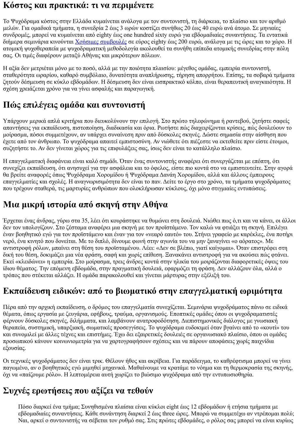 Κόστος και πρακτικά: τι να περιμένετε Το Ψυχόδραμα κόστος στην Ελλάδα κυμαίνεται ανάλογα με τον συντονιστή, τη διάρκεια, το πλαίσιο και τον αριθμό μελών. Για ομαδικά τμήματα, η συνεδρία 2 έως 3 ωρών κοστίζει συνήθως 20 έως 40 ευρώ ανά άτομο. Σε μηνιαίες συνδρομές, μπορεί να κυμαίνεται από eighty έως one hundred sixty ευρώ για εβδομαδιαίες συναντήσεις. Τα εντατικά διήμερα σεμινάρια κινούνται Χρήσιμες συμβουλές σε εύρος eighty έως 200 ευρώ, ανάλογα με τις ώρες και το χώρο. Η ατομική ψυχοθεραπεία με ψυχοδραματική μεθοδολογία ακολουθεί τα συνήθη επίπεδα ατομικής συνεδρίας στην πόλη σας. Οι τιμές διαφέρουν μεταξύ Αθήνας και μικρότερων πόλεων. Η αξία δεν μετριέται μόνο με το ποσό, αλλά με την ποιότητα πλαισίου: μέγεθος ομάδας, εμπειρία συντονιστή, σταθερότητα ωραρίου, καθαρό συμβόλαιο, δυνατότητα αναπλήρωσης, τήρηση απορρήτου. Επίσης, τα σοβαρά τμήματα ζητούν δέσμευση σε κύκλο εβδομάδων. Η δέσμευση δεν είναι εισπρακτικό κόλπο, είναι θεραπευτική αναγκαιότητα. Η σχέση χρειάζεται χρόνο για να γίνει ασφαλής και παραγωγική. Πώς επιλέγεις ομάδα και συντονιστή Υπάρχουν μερικά απλά κριτήρια που διευκολύνουν την επιλογή. Στο πρώτο τηλεφώνημα ή ραντεβού, ζητήστε σαφείς απαντήσεις για εκπαίδευση, πιστοποίηση, διαδικασία και όρια. Ρωτήστε πώς διαχειρίζονται κρίσεις, πώς δουλεύουν το μοίρασμα, πόσοι συμμετέχουν, αν υπάρχει συναίνεση πριν από δύσκολες σκηνές. Δώστε σημασία στην αίσθηση που έχετε από τον άνθρωπο. Το ψυχόδραμα απαιτεί εμπιστοσύνη. Αν νιώθετε ότι πιέζεστε να εκτεθείτε πριν είστε έτοιμοι, συζητήστε το. Αν δεν γίνεται χώρος για τις επιφυλάξεις σας, ίσως δεν είναι το κατάλληλο πλαίσιο. Η επαγγελματική διαφάνεια είναι καλό σημάδι. Όταν ένας συντονιστής αναφέρει ότι συνεργάζεται με επόπτη, ότι συνεχίζει εκπαίδευση, ότι ανησυχεί για την ασφάλεια και το όφελος, είστε πιο κοντά στο να εμπιστευτείτε. Στην αγορά θα βρείτε αναφορές όπως Ψυχόδραμα Χορομίδου ή Ψυχόδραμα Δανάη Χορομίδου, αλλά και άλλους έμπειρους επαγγελματίες και σχολές. Η αναγνωρισιμότητα δεν είναι το παν. Δείτε το έργο στο χρόνο, τα τμήματα ψυχοδράματος που τρέχουν σταθερά, τις μαρτυρίες ανθρώπων που ολοκλήρωσαν κύκλους, όχι μόνο στιγμιαίες εντυπώσεις. Μια μικρή ιστορία από σκηνή στην Αθήνα Έρχεται ένας άνδρας, γύρω στα 35, λέει ότι κουράστηκε να θυμώνει στη δουλειά. Νιώθει πως ό,τι και να κάνει, οι άλλοι δεν τον υπολογίζουν. Στο ζέσταμα αναφέρει μια σκηνή με τον προϊστάμενο. Τον καλώ να φτιάξει τη σκηνή. Επιλέγει έναν βοηθητικό εγώ για τον προϊστάμενο και έναν για τον «νεαρό εαυτό» του. Στήνει γραφείο με καρέκλες, ένα ποτήρι νερό, ένα κινητό που δονείται. Με το διπλό, δίνουμε φωνή στην αγωνία του να μην ξαναγίνει «ο αόρατος». Με αντιστροφή ρόλων, μπαίνει στη θέση του προϊσταμένου. Λέει: «Δεν σε βλέπω, γιατί καίγομαι». Όταν επιστρέφει στη δική του θέση, δοκιμάζει μια νέα φράση, σαφή και χωρίς επίθεση. Ξανακάνει αντιστροφή για να ακούσει πώς φτάνει. Εκεί «κλειδώνει» η εμπειρία. Στο μοίρασμα, τρεις άνδρες κοντά στην ηλικία του μοιράζονται διαφορετικές όψεις του ίδιου θέματος. Την επόμενη εβδομάδα, στην πραγματική δουλειά, εφαρμόζει τη φράση. Δεν αλλάζουν όλα, αλλά ο τρόπος που στέκεται αλλάζει. Η ομάδα παρακολουθεί και γίνεται μάρτυρας στην εξέλιξή του. Εκπαίδευση ειδικών: από το βιωματικό στην επαγγελματική ωριμότητα Πέρα από την αρχική εκπαίδευση, ο δρόμος του επαγγελματία συνεχίζεται. Σεμινάρια ψυχ