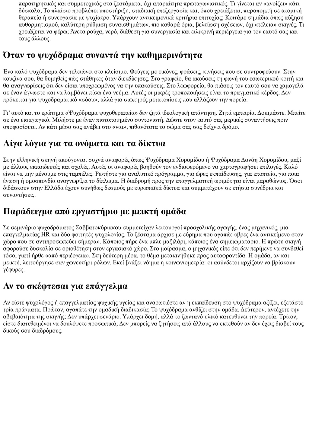 παρατηρητικός και συμμετοχικός στα ζεστάματα, όχι απαραίτητα πρωταγωνιστικός. Τι γίνεται αν «ανοίξει» κάτι δύσκολο; Το πλαίσιο προβλέπει υποστήριξη, σταδιακή επεξεργασία και, όπου χρειάζεται, παραπομπή σε ατομική θεραπεία ή συνεργασία με ψυχίατρο. Υπάρχουν αντικειμενικά κριτήρια επιτυχίας; Κοιτάμε σημάδια όπως αύξηση αυθορμητισμού, καλύτερη ρύθμιση συναισθημάτων, πιο καθαρά όρια, βελτίωση σχέσεων, όχι «τέλεια» σκηνές. Τι χρειάζεται να φέρω; Άνετα ρούχα, νερό, διάθεση για συνεργασία και ειλικρινή περιέργεια για τον εαυτό σας και τους άλλους. Όταν το ψυχόδραμα συναντά την καθημερινότητα Ένα καλό ψυχόδραμα δεν τελειώνει στο κλείσιμο. Φεύγεις με εικόνες, φράσεις, κινήσεις που σε συντροφεύουν. Στην κουζίνα σου, θα θυμηθείς πώς στάθηκες όταν διεκδίκησες. Στο γραφείο, θα ακούσεις τη φωνή του εσωτερικού κριτή και θα αναγνωρίσεις ότι δεν είσαι υποχρεωμένος να την υπακούσεις. Στο λεωφορείο, θα πιάσεις τον εαυτό σου να χαμογελά σε έναν άγνωστο και να λαμβάνει πίσω ένα νεύμα. Αυτές οι μικρές τροποποιήσεις είναι το πραγματικό κέρδος. Δεν πρόκειται για ψυχοδραματικό «σόου», αλλά για σιωπηρές μετατοπίσεις που αλλάζουν την πορεία. Γι’ αυτό και το ερώτημα «Ψυχόδραμα ψυχοθεραπεία» δεν ζητά ιδεολογική απάντηση. Ζητά εμπειρία. Δοκιμάστε. Μπείτε σε ένα εισαγωγικό. Μιλήστε με έναν πιστοποιημένο συντονιστή. Δώστε στον εαυτό σας μερικές συναντήσεις πριν αποφασίσετε. Αν κάτι μέσα σας ανάβει στο «ναι», πιθανότατα το σώμα σας σας δείχνει δρόμο. Λίγα λόγια για τα ονόματα και τα δίκτυα Στην ελληνική σκηνή ακούγονται συχνά αναφορές όπως Ψυχόδραμα Χορομίδου ή Ψυχόδραμα Δανάη Χορομίδου, μαζί με άλλους εκπαιδευτές και σχολές. Αυτές οι αναφορές βοηθούν τον ενδιαφερόμενο να χαρτογραφήσει επιλογές. Καλό είναι να μην μένουμε στις ταμπέλες. Ρωτήστε για αναλυτικό πρόγραμμα, για ώρες εκπαίδευσης, για εποπτεία, για ποια ένωση ή ομοσπονδία αναγνωρίζει το δίπλωμα. Η διαδρομή προς την επαγγελματική ωριμότητα είναι μαραθώνιος. Όσοι διδάσκουν στην Ελλάδα έχουν συνήθως δεσμούς με ευρωπαϊκά δίκτυα και συμμετέχουν σε ετήσια συνέδρια και συναντήσεις. Παράδειγμα από εργαστήριο με μεικτή ομάδα Σε σεμινάριο ψυχοδράματος Σαββατοκύριακου συμμετείχαν λειτουργοί προσχολικής αγωγής, ένας μηχανικός, μια επαγγελματίας HR και δύο φοιτητές ψυχολογίας. Το ζέσταμα άρχισε με εύρημα που αγαπώ: «βρες ένα αντικείμενο στον χώρο που σε αντιπροσωπεύει σήμερα». Κάποιος πήρε ένα μπλε μαξιλάρι, κάποιος ένα σημειωματάριο. Η πρώτη σκηνή αφορούσε δυσκολία σε οριοθέτηση στον εργασιακό χώρο. Στο μοίρασμα, ο μηχανικός είπε ότι δεν περίμενε να συνδεθεί τόσο, γιατί ήρθε «από περιέργεια». Στη δεύτερη μέρα, το θέμα μετακινήθηκε προς αυτοφροντίδα. Η ομάδα, αν και μεικτή, λειτούργησε σαν χωνευτήρι ρόλων. Εκεί βγάζει νόημα η κοινωνιομετρία: οι ασύνδετοι αρχίζουν να βρίσκουν γέφυρες. Αν το σκέφτεσαι για επάγγελμα Αν είστε ψυχολόγος ή επαγγελματίας ψυχικής υγείας και αναρωτιέστε αν η εκπαίδευση στο ψυχόδραμα αξίζει, εξετάστε τρία πράγματα. Πρώτον, αγαπάτε την ομαδική διαδικασία; Το ψυχόδραμα ανθίζει στην ομάδα. Δεύτερον, αντέχετε την αβεβαιότητα της σκηνής; Δεν υπάρχει σενάριο. Υπάρχει δομή, αλλά το ζωντανό υλικό κατευθύνει την πορεία. Τρίτον, είστε διατεθειμένοι να δουλέψετε προσωπικά; Δεν μπορείς να ζητήσεις από άλλους να εκτεθούν αν δεν έχεις διαβεί τους δικούς σου διαδρόμους.
