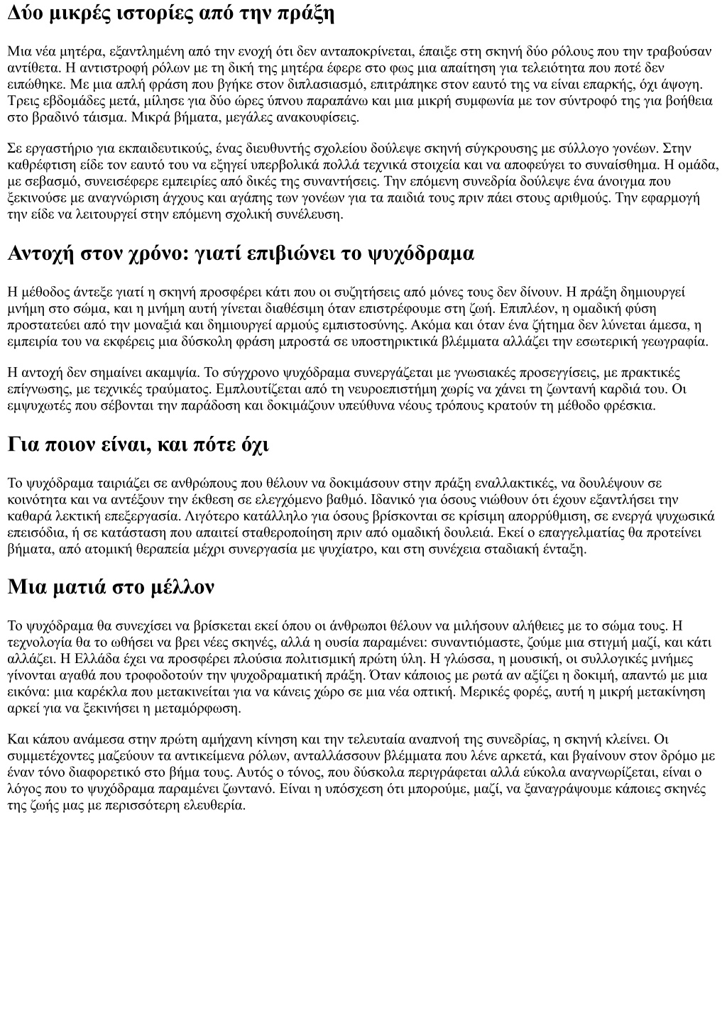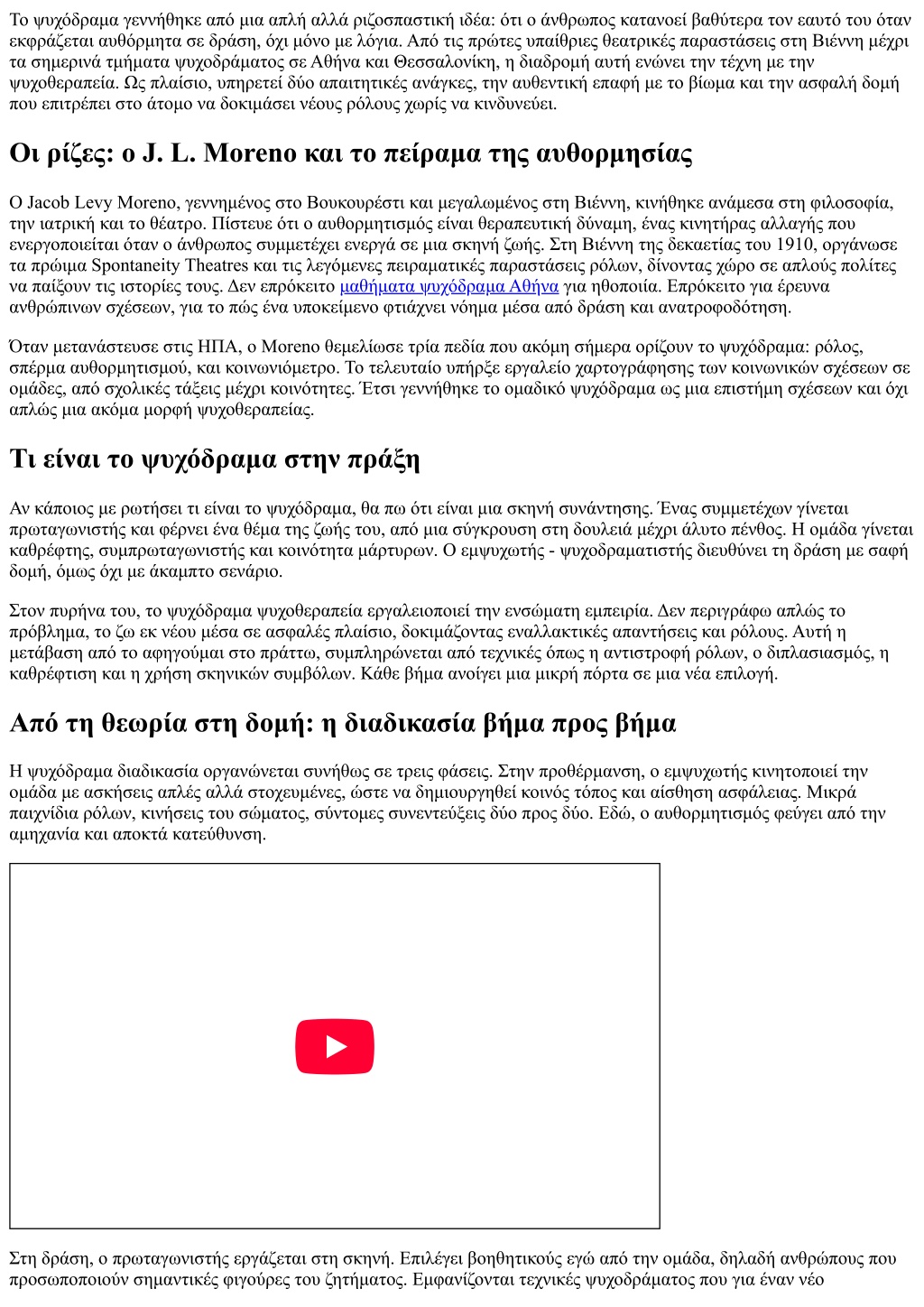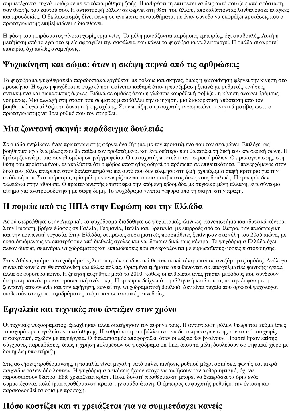 συμμετέχοντα συχνά μοιάζουν με επιτόπια μάθηση ζωής. Η καθρέφτιση επιτρέπει να δεις αυτό που ζεις από απόσταση, σαν θεατής του εαυτού σου. Η αντιστροφή ρόλων σε φέρνει στη θέση του άλλου, αποκαλύπτοντας λανθάνουσες ανάγκες και προσδοκίες. Ο διπλασιασμός δίνει φωνή σε ανείπωτα συναισθήματα, με έναν συνοδό να εκφράζει προτάσεις που ο πρωταγωνιστής επιβεβαιώνει ή διορθώνει. Η φάση του μοιράσματος γίνεται χωρίς ερμηνείες. Τα μέλη μοιράζονται παρόμοιες εμπειρίες, όχι συμβουλές. Αυτή η μετάβαση από το εγώ στο εμείς σφραγίζει την ασφάλεια που κάνει το ψυχόδραμα να λειτουργεί. Η ομάδα συγκροτεί εμπειρία, όχι απλώς αναμνήσεις. Ψυχοκίνηση και σώμα: όταν η σκέψη περνά από τις αρθρώσεις Το ψυχόδραμα ψυχοθεραπεία παραδοσιακά εργάζεται με ρόλους και σκηνές, όμως η ψυχοκίνηση φέρνει την κίνηση στο προσκήνιο. Η σχέση ψυχόδραμα ψυχοκίνηση φαίνεται καθαρά όταν η παρέμβαση ξεκινά με ρυθμικές κινήσεις, αντικείμενα και σωματικούς άξονες. Ειδικά σε ομάδες όπου η γλώσσα κουράζει ή φοβίζει, η κίνηση ανοίγει δρόμους νοήματος. Μια αλλαγή στη στάση του σώματος μεταβάλλει την αφήγηση, μια διαφορετική απόσταση από τον βοηθητικό εγώ αλλάζει τη δυναμική της σχέσης. Στην πράξη, ο εμψυχωτής ενσωματώνει κινητικά μοτίβα, ώστε ο πρωταγωνιστής να βρει ρυθμό που τον στηρίζει. Μια ζωντανή σκηνή: παράδειγμα δουλειάς Σε ομάδα ενηλίκων, ένας πρωταγωνιστής φέρνει ένα ζήτημα με τον προϊστάμενο που τον απαξιώνει. Επιλέγει ως βοηθητικό εγώ ένα μέλος που θα παίξει τον προϊστάμενο, και ένα δεύτερο που θα παίξει τη δική του εσωτερική φωνή. Η δράση ξεκινά με μια συνηθισμένη σκηνή γραφείου. Ο εμψυχωτής προτείνει αντιστροφή ρόλων. Ο πρωταγωνιστής, στη θέση του προϊσταμένου, ανακαλύπτει ότι ο φόβος αποτυχίας οδηγεί το πρόσωπο σε επιθετικότητα. Επανερχόμενος στον δικό του ρόλο, επιτρέπει στον διπλασιασμό να πει αυτό που δεν τόλμησε στη ζωή: χρειάζομαι σαφή κριτήρια για την απόδοσή μου. Στο μοίρασμα, τρία μέλη αναγνωρίζουν παρόμοια μοτίβα στις δικές τους δουλειές. Η εμπειρία δεν τελειώνει στην αίθουσα. Ο πρωταγωνιστής επιστρέφει την επόμενη εβδομάδα με συγκεκριμένη αλλαγή, ένα σύντομο αίτημα για ανατροφοδότηση με σαφή δομή. Το ψυχόδραμα γίνεται γέφυρα από τη σκηνή στην πράξη. Η πορεία από τις ΗΠΑ στην Ευρώπη και την Ελλάδα Αφού στερεώθηκε στην Αμερική, το ψυχόδραμα διαδόθηκε σε ψυχιατρικές κλινικές, πανεπιστήμια και ιδιωτικά κέντρα. Στην Ευρώπη, βρήκε έδαφος σε Γαλλία, Γερμανία, Ιταλία και Βρετανία, με επιρροές από το θέατρο, την παιδαγωγική και την κοινωνική εργασία. Στην Ελλάδα, οι πρώτες συστηματικές προσπάθειες ξεκίνησαν στα τέλη του 20ού αιώνα, με εκπαιδευόμενους να επιστρέφουν από διεθνείς σχολές και να ιδρύουν δικά τους κέντρα. Το ψυχόδραμα Ελλάδα έχει πλέον δίκτυα, σεμινάρια ψυχοδράματος και εκπαιδεύσεις που συνεργάζονται με ευρωπαϊκούς φορείς πιστοποίησης. Στην Αθήνα, τμήματα ψυχοδράματος λειτουργούν σε ιδιωτικά θεραπευτικά κέντρα και σε ανεξάρτητες ομάδες. Ανάλογα συναντά κανείς σε Θεσσαλονίκη και άλλες πόλεις. Ορισμένα τμήματα απευθύνονται σε επαγγελματίες ψυχικής υγείας, άλλα σε ευρύτερο κοινό. Η ζήτηση αυξήθηκε μετά το 2010, καθώς οι άνθρωποι αναζήτησαν μεθόδους που συνδέουν έκφραση, κοινότητα και προσωπική ανάπτυξη. Η εμπειρία δείχνει ότι η ελληνική κουλτούρα, με την έμφαση στη ζωντανή επικοινωνία και την αφήγηση, ευνοεί την ψυχοδραματική δουλειά. Δεν είναι τ