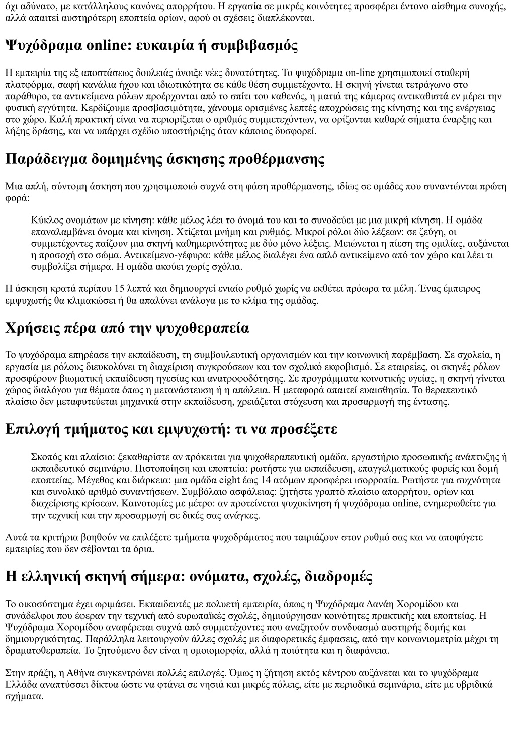 όχι αδύνατο, με κατάλληλους κανόνες απορρήτου. Η εργασία σε μικρές κοινότητες προσφέρει έντονο αίσθημα συνοχής, αλλά απαιτεί αυστηρότερη εποπτεία ορίων, αφού οι σχέσεις διαπλέκονται. Ψυχόδραμα online: ευκαιρία ή συμβιβασμός Η εμπειρία της εξ αποστάσεως δουλειάς άνοιξε νέες δυνατότητες. Το ψυχόδραμα on-line χρησιμοποιεί σταθερή πλατφόρμα, σαφή κανάλια ήχου και ιδιωτικότητα σε κάθε θέση συμμετέχοντα. Η σκηνή γίνεται τετράγωνο στο παράθυρο, τα αντικείμενα ρόλων προέρχονται από το σπίτι του καθενός, η ματιά της κάμερας αντικαθιστά εν μέρει την φυσική εγγύτητα. Κερδίζουμε προσβασιμότητα, χάνουμε ορισμένες λεπτές αποχρώσεις της κίνησης και της ενέργειας στο χώρο. Καλή πρακτική είναι να περιορίζεται ο αριθμός συμμετεχόντων, να ορίζονται καθαρά σήματα έναρξης και λήξης δράσης, και να υπάρχει σχέδιο υποστήριξης όταν κάποιος δυσφορεί. Παράδειγμα δομημένης άσκησης προθέρμανσης Μια απλή, σύντομη άσκηση που χρησιμοποιώ συχνά στη φάση προθέρμανσης, ιδίως σε ομάδες που συναντώνται πρώτη φορά: Κύκλος ονομάτων με κίνηση: κάθε μέλος λέει το όνομά του και το συνοδεύει με μια μικρή κίνηση. Η ομάδα επαναλαμβάνει όνομα και κίνηση. Χτίζεται μνήμη και ρυθμός. Μικροί ρόλοι δύο λέξεων: σε ζεύγη, οι συμμετέχοντες παίζουν μια σκηνή καθημερινότητας με δύο μόνο λέξεις. Μειώνεται η πίεση της ομιλίας, αυξάνεται η προσοχή στο σώμα. Αντικείμενο-γέφυρα: κάθε μέλος διαλέγει ένα απλό αντικείμενο από τον χώρο και λέει τι συμβολίζει σήμερα. Η ομάδα ακούει χωρίς σχόλια. Η άσκηση κρατά περίπου 15 λεπτά και δημιουργεί ενιαίο ρυθμό χωρίς να εκθέτει πρόωρα τα μέλη. Ένας έμπειρος εμψυχωτής θα κλιμακώσει ή θα απαλύνει ανάλογα με το κλίμα της ομάδας. Χρήσεις πέρα από την ψυχοθεραπεία Το ψυχόδραμα επηρέασε την εκπαίδευση, τη συμβουλευτική οργανισμών και την κοινωνική παρέμβαση. Σε σχολεία, η εργασία με ρόλους διευκολύνει τη διαχείριση συγκρούσεων και τον σχολικό εκφοβισμό. Σε εταιρείες, οι σκηνές ρόλων προσφέρουν βιωματική εκπαίδευση ηγεσίας και ανατροφοδότησης. Σε προγράμματα κοινοτικής υγείας, η σκηνή γίνεται χώρος διαλόγου για θέματα όπως η μετανάστευση ή η απώλεια. Η μεταφορά απαιτεί ευαισθησία. Το θεραπευτικό πλαίσιο δεν μεταφυτεύεται μηχανικά στην εκπαίδευση, χρειάζεται στόχευση και προσαρμογή της έντασης. Επιλογή τμήματος και εμψυχωτή: τι να προσέξετε Σκοπός και πλαίσιο: ξεκαθαρίστε αν πρόκειται για ψυχοθεραπευτική ομάδα, εργαστήριο προσωπικής ανάπτυξης ή εκπαιδευτικό σεμινάριο. Πιστοποίηση και εποπτεία: ρωτήστε για εκπαίδευση, επαγγελματικούς φορείς και δομή εποπτείας. Μέγεθος και διάρκεια: μια ομάδα eight έως 14 ατόμων προσφέρει ισορροπία. Ρωτήστε για συχνότητα και συνολικό αριθμό συναντήσεων. Συμβόλαιο ασφάλειας: ζητήστε γραπτό πλαίσιο απορρήτου, ορίων και διαχείρισης κρίσεων. Καινοτομίες με μέτρο: αν προτείνεται ψυχοκίνηση ή ψυχόδραμα online, ενημερωθείτε για την τεχνική και την προσαρμογή σε δικές σας ανάγκες. Αυτά τα κριτήρια βοηθούν να επιλέξετε τμήματα ψυχοδράματος που ταιριάζουν στον ρυθμό σας και να αποφύγετε εμπειρίες που δεν σέβονται τα όρια. Η ελληνική σκηνή σήμερα: ονόματα, σχολές, διαδρομές Το οικοσύστημα έχει ωριμάσει. Εκπαιδευτές με πολυετή εμπειρία, όπως η Ψυχόδραμα Δανάη Χορομίδου και συνάδελφοι που έφεραν την τεχνική από ευρωπαϊκές σχολές, δημιούργησαν κοινότητες πρακτικής και εποπτείας. Η Ψυχόδραμα Χορομίδου αναφέρεται συχνά από συμμετέχο