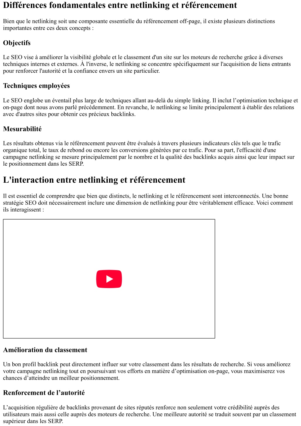 Différences fondamentales entre netlinking et référencement Bien que le netlinking soit une composante essentielle du référencement off-page, il existe plusieurs distinctions importantes entre ces deux concepts : Objectifs Le SEO vise à améliorer la visibilité globale et le classement d'un site sur les moteurs de recherche grâce à diverses techniques internes et externes. À l'inverse, le netlinking se concentre spécifiquement sur l'acquisition de liens entrants pour renforcer l'autorité et la confiance envers un site particulier. Techniques employées Le SEO englobe un éventail plus large de techniques allant au-delà du simple linking. Il inclut l’optimisation technique et on-page dont nous avons parlé précédemment. En revanche, le netlinking se limite principalement à établir des relations avec d'autres sites pour obtenir ces précieux backlinks. Mesurabilité Les résultats obtenus via le référencement peuvent être évalués à travers plusieurs indicateurs clés tels que le trafic organique total, le taux de rebond ou encore les conversions générées par ce trafic. Pour sa part, l'efficacité d'une campagne netlinking se mesure principalement par le nombre et la qualité des backlinks acquis ainsi que leur impact sur le positionnement dans les SERP. L'interaction entre netlinking et référencement Il est essentiel de comprendre que bien que distincts, le netlinking et le référencement sont interconnectés. Une bonne stratégie SEO doit nécessairement inclure une dimension de netlinking pour être véritablement efficace. Voici comment ils interagissent : Amélioration du classement Un bon profil backlink peut directement influer sur votre classement dans les résultats de recherche. Si vous améliorez votre campagne netlinking tout en poursuivant vos efforts en matière d’optimisation on-page, vous maximiserez vos chances d’atteindre un meilleur positionnement. Renforcement de l’autorité L’acquisition régulière de backlinks provenant de sites réputés renforce non seulement votre crédibilité auprès des utilisateurs mais aussi celle auprès des moteurs de recherche. Une meilleure autorité se traduit souvent par un classement supérieur dans les SERP.