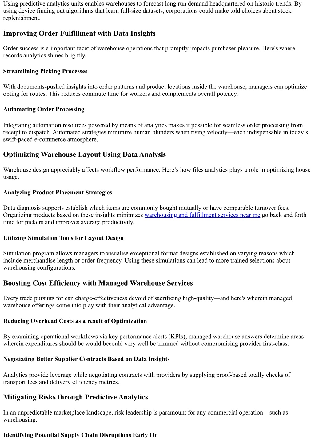Using predictive analytics units enables warehouses to forecast long run demand headquartered on historic trends. By using device finding out algorithms that learn full-size datasets, corporations could make told choices about stock replenishment. Improving Order Fulfillment with Data Insights Order success is a important facet of warehouse operations that promptly impacts purchaser pleasure. Here's where records analytics shines brightly. Streamlining Picking Processes With documents-pushed insights into order patterns and product locations inside the warehouse, managers can optimize opting for routes. This reduces commute time for workers and complements overall potency. Automating Order Processing Integrating automation resources powered by means of analytics makes it possible for seamless order processing from receipt to dispatch. Automated strategies minimize human blunders when rising velocity—each indispensable in today’s swift-paced e-commerce atmosphere. Optimizing Warehouse Layout Using Data Analysis Warehouse design appreciably affects workflow performance. Here’s how files analytics plays a role in optimizing house usage. Analyzing Product Placement Strategies Data diagnosis supports establish which items are commonly bought mutually or have comparable turnover fees. Organizing products based on these insights minimizes warehousing and fulfillment services near me go back and forth time for pickers and improves average productivity. Utilizing Simulation Tools for Layout Design Simulation program allows managers to visualise exceptional format designs established on varying reasons which include merchandise length or order frequency. Using these simulations can lead to more trained selections about warehousing configurations. Boosting Cost Efficiency with Managed Warehouse Services Every trade pursuits for can charge-effectiveness devoid of sacrificing high-quality—and here's wherein managed warehouse offerings come into play with their analytical advantage. Reducing Overhead Costs as a result of Optimization By examining operational workflows via key performance alerts (KPIs), managed warehouse answers determine areas wherein expenditures should be would becould very well be trimmed without compromising provider first-class. Negotiating Better Supplier Contracts Based on Data Insights Analytics provide leverage while negotiating contracts with providers by supplying proof-based totally checks of transport fees and delivery efficiency metrics. Mitigating Risks through Predictive Analytics In an unpredictable marketplace landscape, risk leadership is paramount for any commercial operation—such as warehousing. Identifying Potential Supply Chain Disruptions Early On