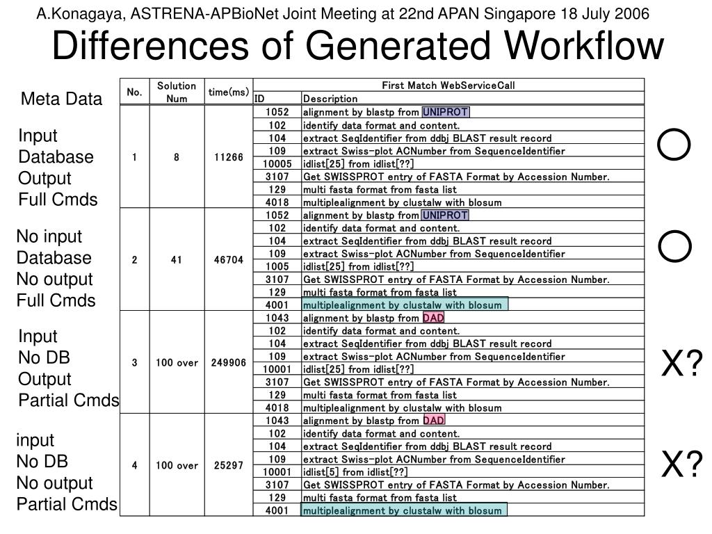Task Database (prototype) Web Service Call DDBJ Blast DDBJ SRS DDBJ GetEntry DDBJ ClustalW SPBIO Blast 453 638 38 62 405 56 45 Format Transformation Data Selection 1697 In Total