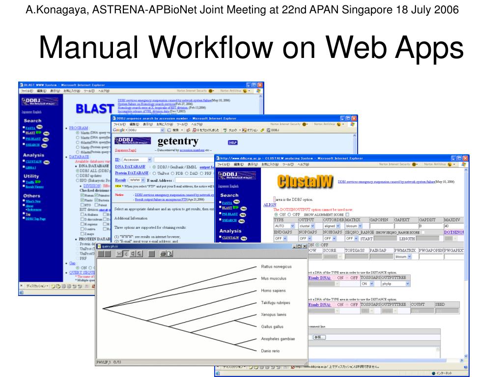 Bioinformatics Ontology for Automatic Workflow Generation on Web/Grid Services . Konagaya Akihiko Project Director Advanced Genome Information Technology Research Group RIKEN Genomic Sciences Center. Contents. Role of Ontology Web Services for Bioinformatics Automatics Workflow Generation