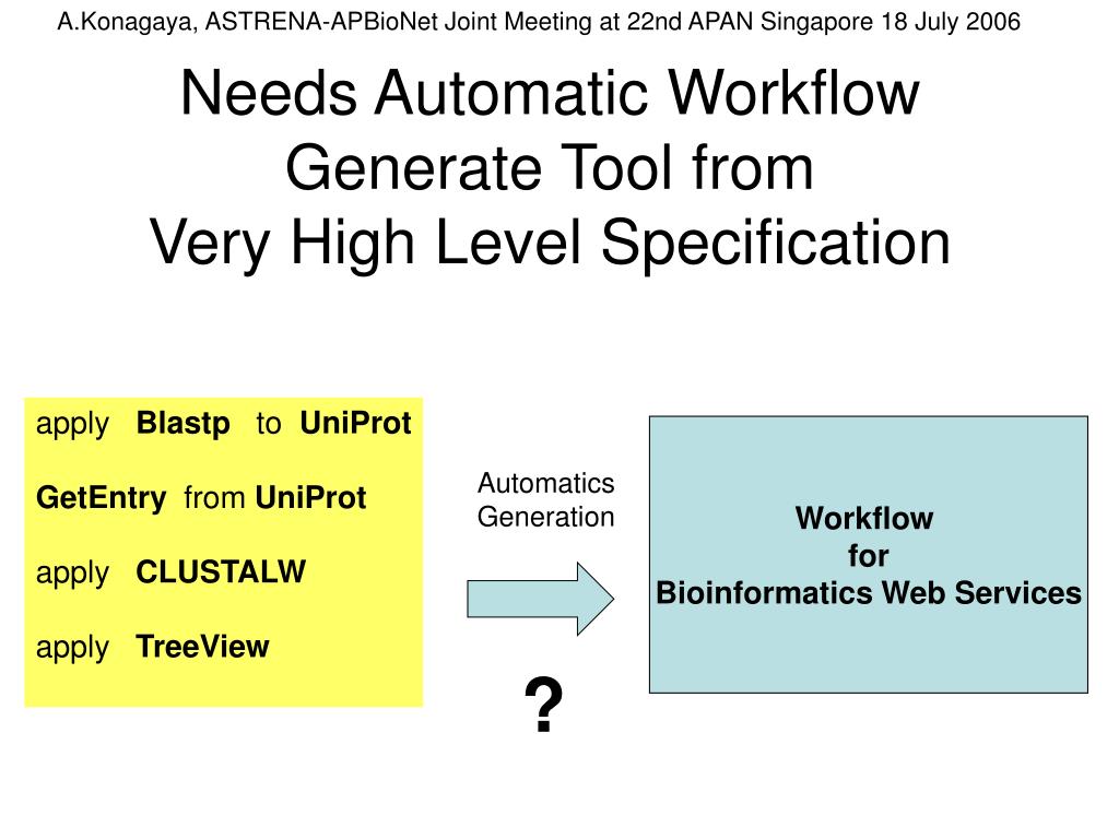 Needs Automatic Workflow Generate Tool from Very High Level Specification apply Blastp to UniProt GetEntry from UniProt apply CLUSTALW apply TreeView Workflow for Bioinformatics Web Services Automatics Generation ?