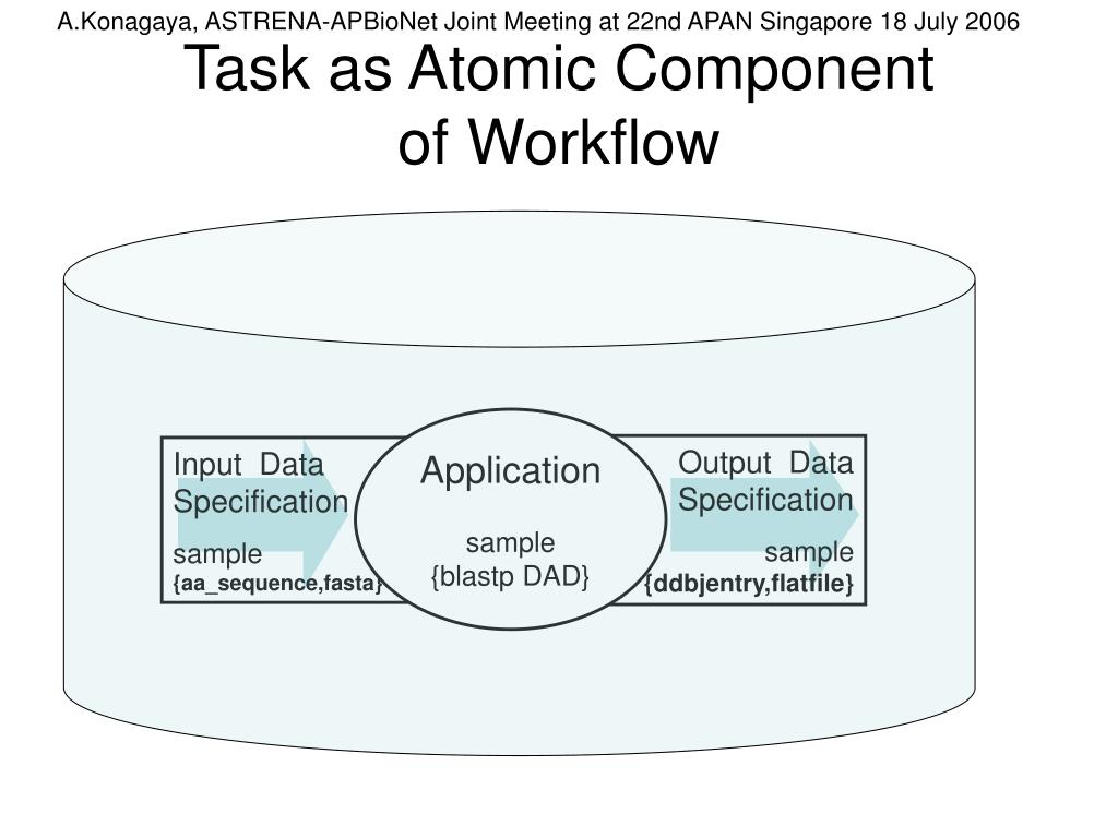 Task as Atomic Componentof Workflow Application sample {blastp DAD} Output DataSpecificationsample {ddbjentry,flatfile} Input DataSpecificationsample {aa_sequence,fasta}