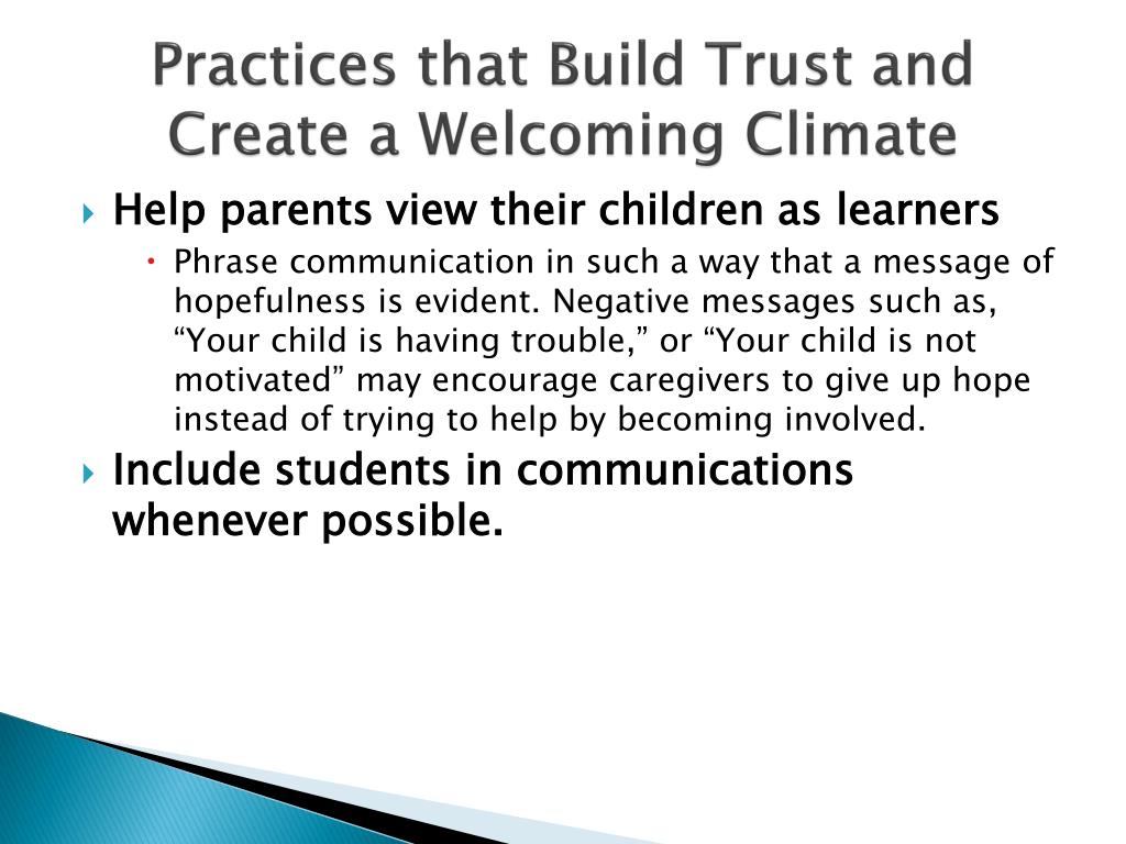 Practices that Build Trust and Create a Welcoming Climate • Greeting families by name and initiating positive contact when they first enter the school • Maintaining a point of contact between home and school • Preparing print materials in multiple languages. • Checking the tone and content of messages school personnel convey • Providing prompt responses to parent concerns