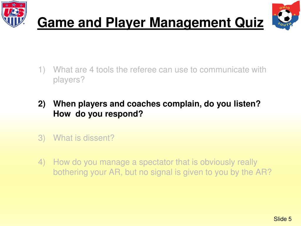 What are 4 tools the referee can use to communicate with players? When players and coaches complain, do you listen? How do you respond? What is dissent? How do you manage a spectator that is obviously really bothering your AR, but no signal is given to you by the AR? Game and Player Management Quiz