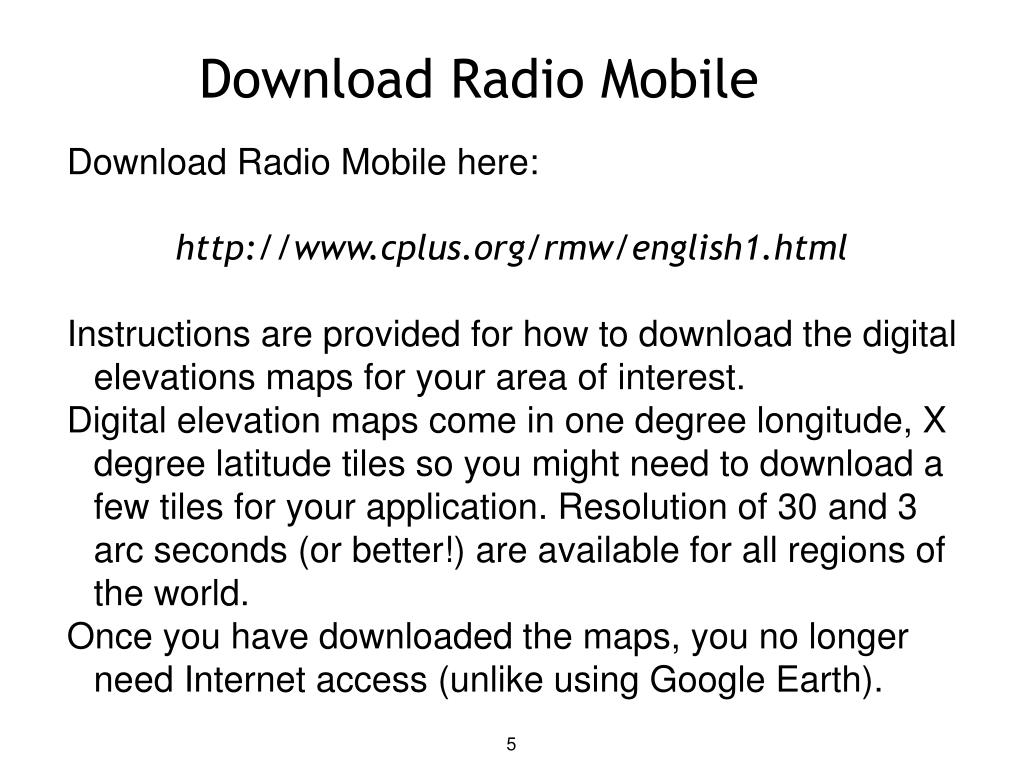 Download Radio Mobile Download Radio Mobile here: http://www.cplus.org/rmw/english1.html Instructions are provided for how to download the digital elevations maps for your area of interest. Digital elevation maps come in one degree longitude, X degree latitude tiles so you might need to download a few tiles for your application. Resolution of 30 and 3 arc seconds (or better!) are available for all regions of the world. Once you have downloaded the maps, you no longer need Internet access (unlike using Google Earth). 5