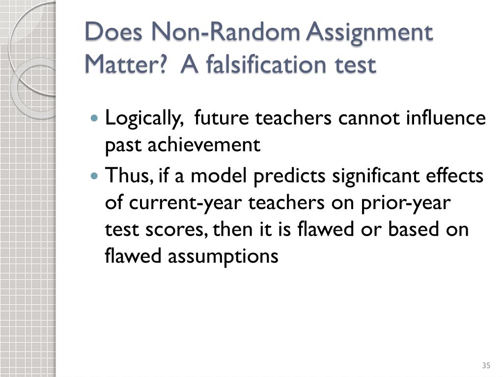 Does Non-Random Assignment Matter? A falsification test • Logically, future teachers cannot influence past achievement • Thus, if a model predicts significant effects of current-year teachers on prior-year test scores, then it is flawed or based on flawed assumptions