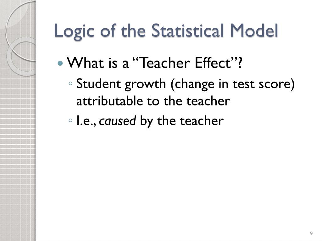 Logic of the Statistical Model • What is a “Teacher Effect”? • Student growth (change in test score) attributable to the teacher • I.e., caused by the teacher