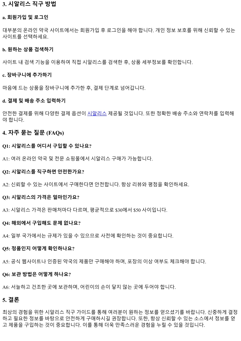 2. 3. 시알리스직구방법 a. 회원가입및로그인 대부분의온라인약국사이트에서는회원가입후로그인을해야합니다. 개인정보보호를위해신뢰할수있는 사이트를선택하세요. b. 원하는상품검색하기 사이트내검색기능을이용하여직접시알리스를검색한후, 상품세부정보를확인합니다. c. 장바구니에추가하기 마음에드는상품을장바구니에추가한후, 결제단계로넘어갑니다. d. 결제및배송주소입력하기 안전한결제를위해다양한결제옵션이시알리스제공될것입니다. 또한정확한배송주소와연락처를입력해 야합니다. 4. 자주묻는질문 (FAQs) Q1: 시알리스를어디서구입할수있나요? A1: 여러온라인약국및전문쇼핑몰에서시알리스구매가가능합니다. Q2: 시알리스를직구하면안전한가요? A2: 신뢰할수있는사이트에서구매한다면안전합니다. 항상리뷰와평점을확인하세요. Q3: 시알리스의가격은얼마인가요? A3: 시알리스가격은판매처마다다르며, 평균적으로 $30에서 $50 사이입니다. Q4: 해외에서구입해도문제없나요? A4: 일부국가에서는규제가있을수있으므로사전에확인하는것이중요합니다. Q5: 정품인지어떻게확인하나요? A5: 공식웹사이트나인증된약국의제품만구매해야하며, 포장의이상여부도체크해야합니다. Q6: 보관방법은어떻게하나요? A6: 서늘하고건조한곳에보관하며, 어린이의손이닿지않는곳에두어야합니다. 5. 결론 최상의경험을위한시알리스직구가이드를통해여러분이원하는정보를얻으셨기를바랍니다. 신중하게결정 하고필요한정보를바탕으로안전하게구매하시길권장합니다. 또한, 항상신뢰할수있는소스에서정보를얻 고제품을구입하는것이중요합니다. 이를통해더욱만족스러운경험을누릴수있을것입니다.
