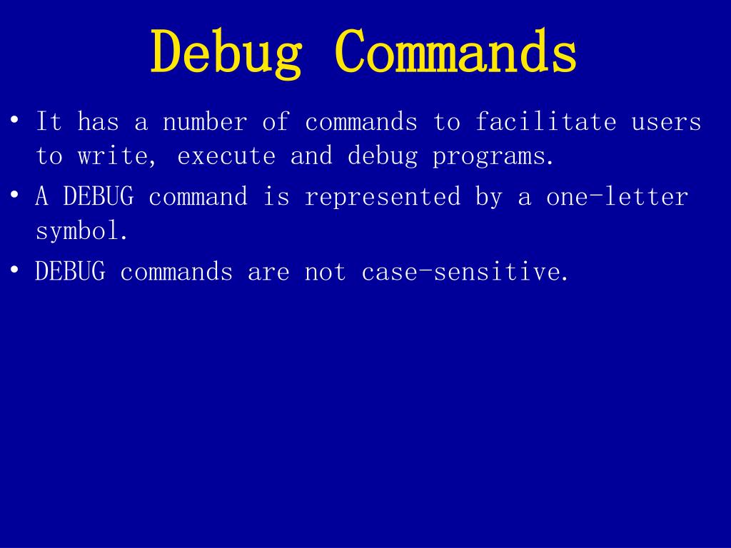 Debug Commands • It has a number of commands to facilitate users to write, execute and debug programs. • A DEBUG command is represented by a one-letter symbol. • DEBUG commands are not case-sensitive.