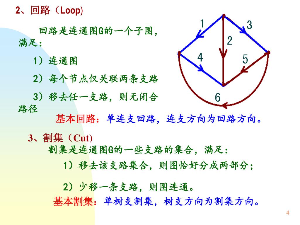 2、回路(Loop) 回路是连通图G的一个子图,满足: 1)连通图 2)每个节点仅关联两条支路 3)移去任一支路,则无闭合路径 基本回路:单连支回路,连支方向为回路方向。 3、割集(Cut) 割集是连通图G的一些支路的集合,满足: 1)移去该支路集合,则图恰好分成两部分; 2)少移一条支路,则图连通。 基本割集:单树支割集,树支方向为割集方向。