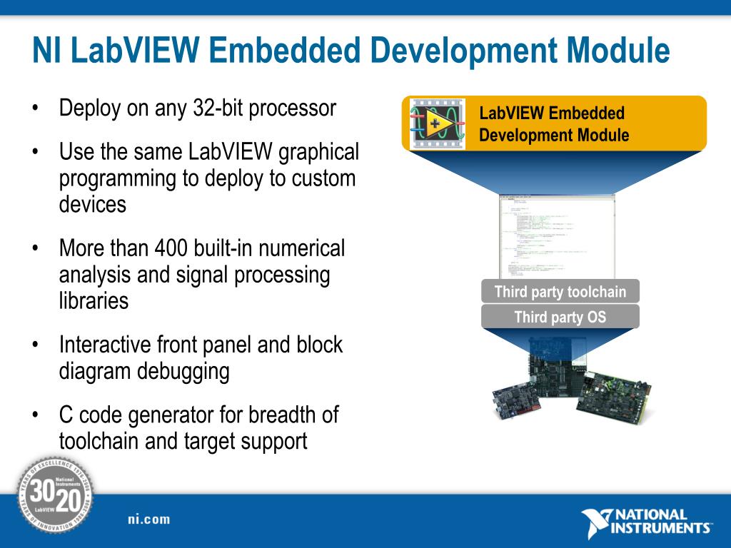 NI LabVIEW Embedded Development Module LabVIEW Embedded Development Module • Deploy on any 32-bit processor • Use the same LabVIEW graphical programming to deploy to custom devices • More than 400 built-in numerical analysis and signal processing libraries • Interactive front panel and block diagram debugging • C code generator for breadth of toolchain and target support Third party toolchain Third party OS