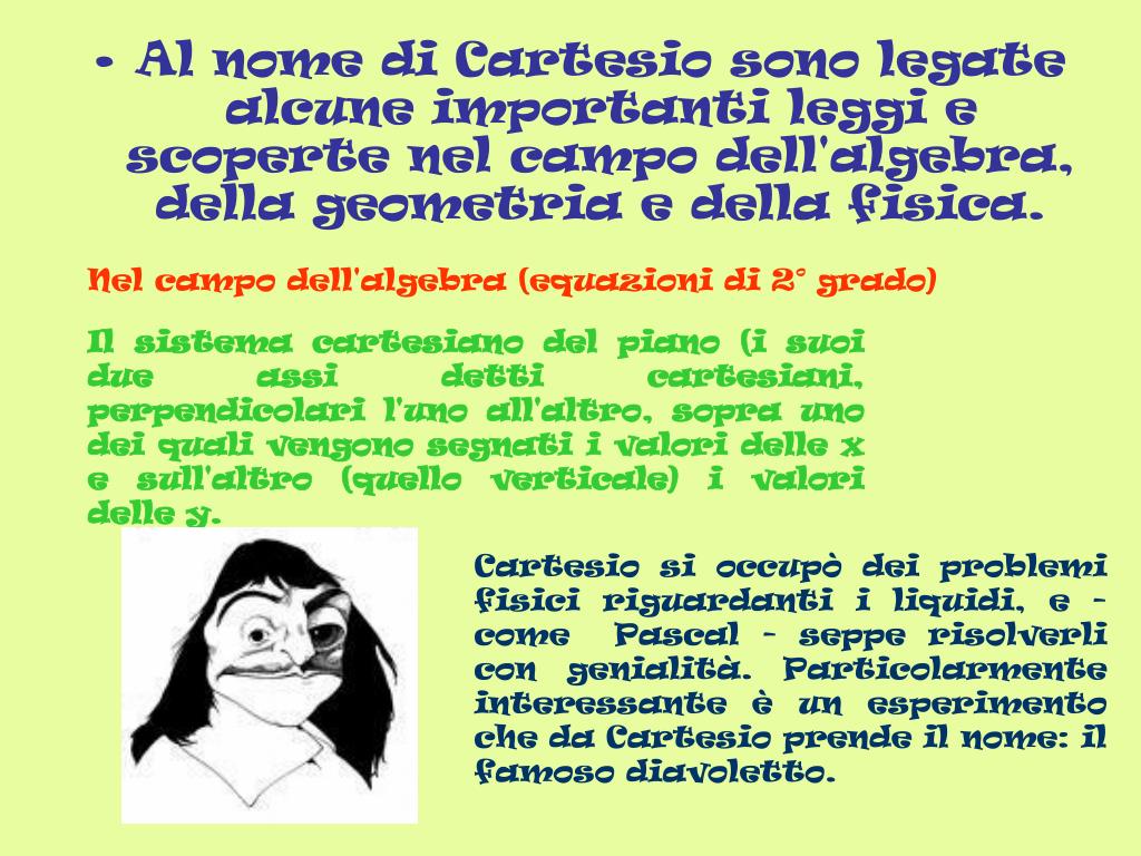 Al nome di Cartesio sono legate alcune importanti leggi e scoperte nel campo dell'algebra, della geometria e della fisica. Nel campo dell'algebra (equazioni di 2° grado) Il sistema cartesiano del piano (i suoi due assi detti cartesiani, perpendicolari l'uno all'altro, sopra uno dei quali vengono segnati i valori delle x e sull'altro (quello verticale) i valori delle y. Cartesio si occupò dei problemi fisici riguardanti i liquidi, e - come Pascal - seppe risolverli con genialità. Particolarmente interessante è un esperimento che da Cartesio prende il nome: il famoso diavoletto.