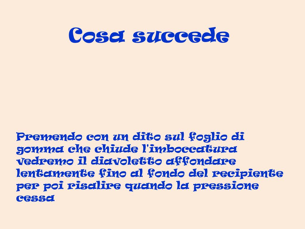 Cosa succede Premendo con un dito sul foglio di gomma che chiude l'imboccatura vedremo il diavoletto affondare lentamente fino al fondo del recipiente per poi risalire quando la pressione cessa