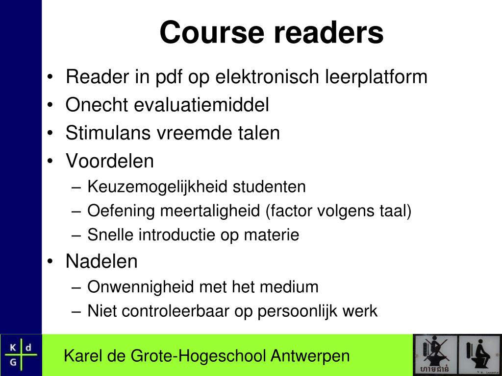 Course readers • Reader in pdf op elektronisch leerplatform • Onecht evaluatiemiddel • Stimulans vreemde talen • Voordelen • Keuzemogelijkheid studenten • Oefening meertaligheid (factor volgens taal) • Snelle introductie op materie • Nadelen • Onwennigheid met het medium • Niet controleerbaar op persoonlijk werk