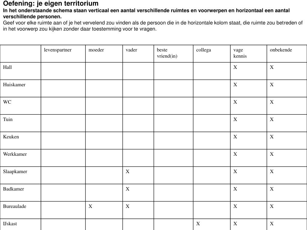 Oefening: je eigen territorium In het onderstaande schema staan verticaal een aantal verschillende ruimtes en voorwerpen en horizontaal een aantal verschillende personen. Geef voor elke ruimte aan of je het vervelend zou vinden als de persoon die in de horizontale kolom staat, die ruimte zou betreden of in het voorwerp zou kijken zonder daar toestemming voor te vragen.