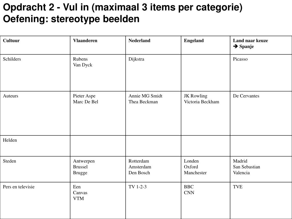 Opdracht 2 - Vul in (maximaal 3 items per categorie)Oefening: stereotype beelden
