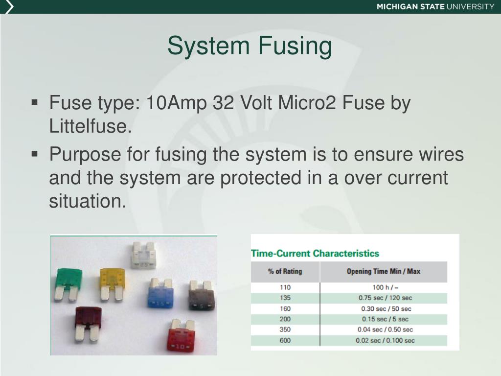 System Fusing • Fuse type: 10Amp 32 Volt Micro2 Fuse by Littelfuse. • Purpose for fusing the system is to ensure wires and the system are protected in a over current situation.